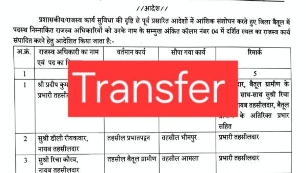 बैतूल: कलेक्टर कार्यालय से जारी आदेश के तहत प्रशासनिक सुविधा और कार्य को ध्यान में रखते हुए जिले में तहसीलदारों और नायब तहसीलदारों...