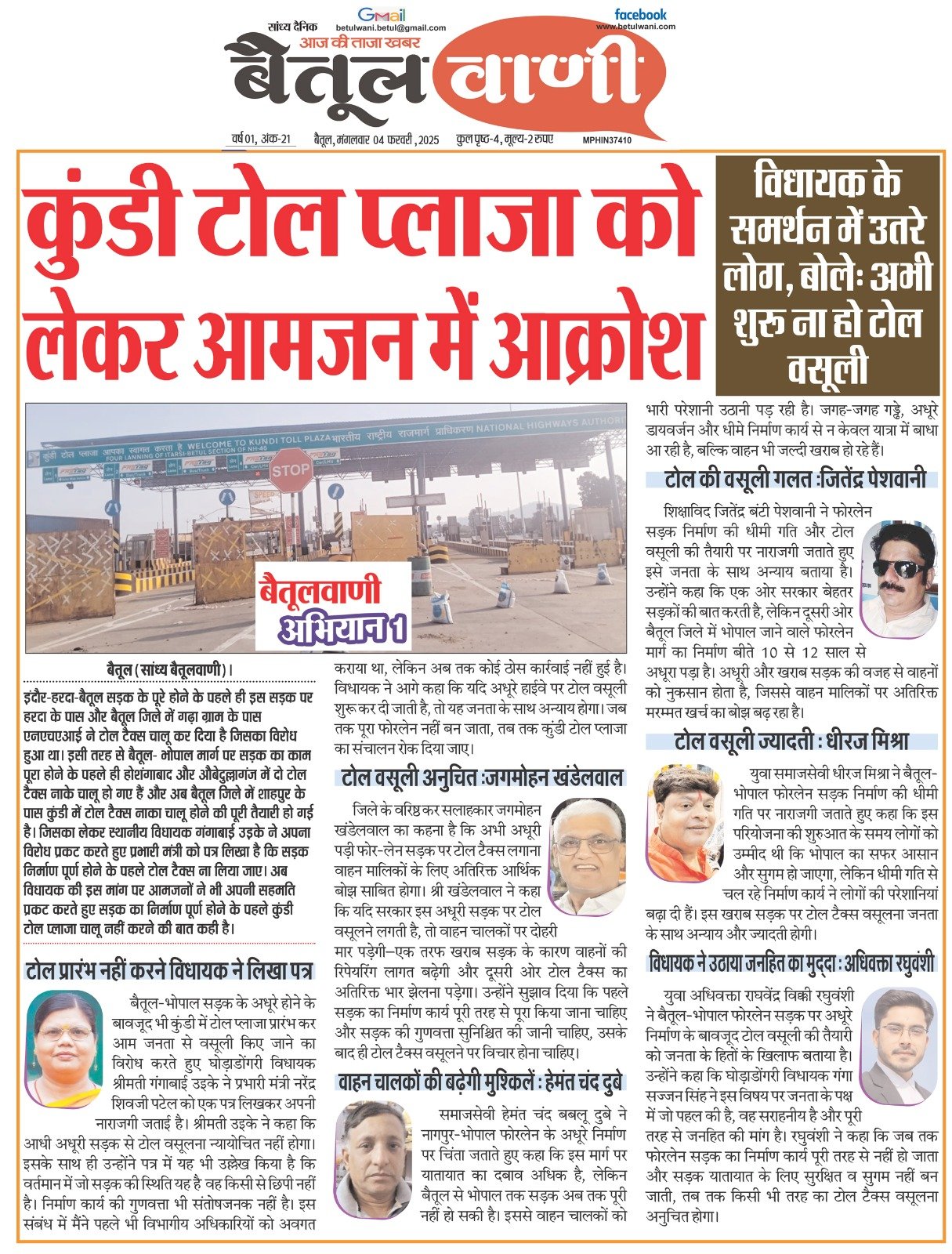 बैतूल। बैतूल-भौंरा के बीच एनएचएआई ने फोरलेन निर्माण पूरा होने के पहले ही कुंडी टोल प्लाजा शुरू करने का निर्णय ले लिया है जिसको लेकर स्थानीय जनप्रतिनिधियों से लेकर आम नागरिकों ने विरोध शुरू कर दिया है। इसी कड़ी में अब वाहन चालकों की आपत्ति सामने आ रही है। लोगों का कहना है कि बैतूल के साथ ही क्यों दोहरा व्यवहार किया जा रहा है। जबकि अन्य जिलों में एनएचएआई ने जो भी टोल चालू किए वे सडक़ निर्माण होने के बाद हुए हैं। बैतूल-भोपाल मार्ग पर होशंगाबाद में नर्मदा नदी के आगे और औबेदुल्लागंज के पास दो टोल पूर्व में शुरू किए गए थे क्योंकि बागदेव इटारसी से भोपाल तक फोरलेन का कार्य लगभग पूर्ण हो चुका था।