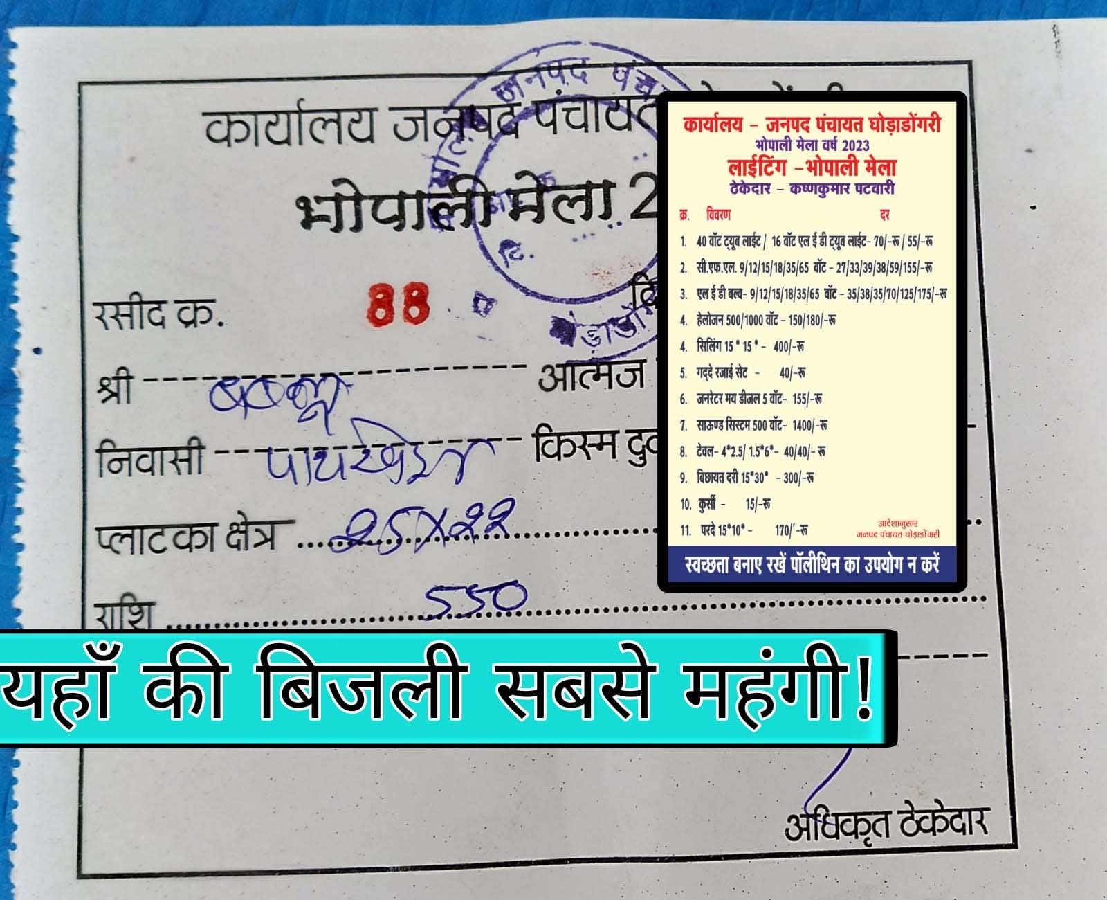 Patwari Electricity News – सारनी – मध्यप्रदेश के 52 जिले में सबसे महंगी बिजली अगर कहीं बिकती है तो वह बैतूल जिले के भोपाली मेले में यहां पर 16 वाट के एक एलइडी ट्यूब लाइट का 24 घंटे का बिजली का बिल 250 रुपए वसूलने का काम ठेकेदार कृष्ण कुमार पटवारी के कर्मचारी बेखौफ होकर कर रहे हैं।