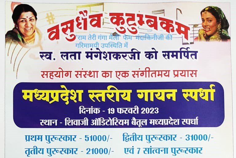 State level singing competition – बैतूल – वसुधैव कुटुम्बकम, राम तेरी गंगा मैली फेम मंदाकिनी की उपस्थिति में स्व. लता मंगेशकर को समर्पित सहयोग संस्था का एक संगीतमय प्रयास मध्यप्रदेश स्तरीय गायन स्पर्धा का आयोजन आगामी 19 फरवरी को शिवाजी ऑडिटोरियम, बैतूल में रखा गया है।